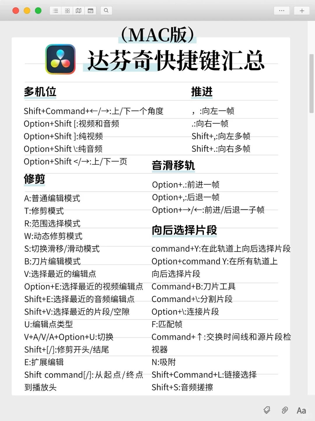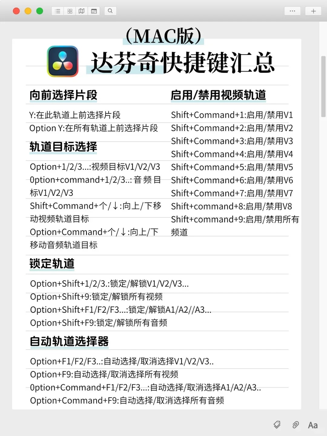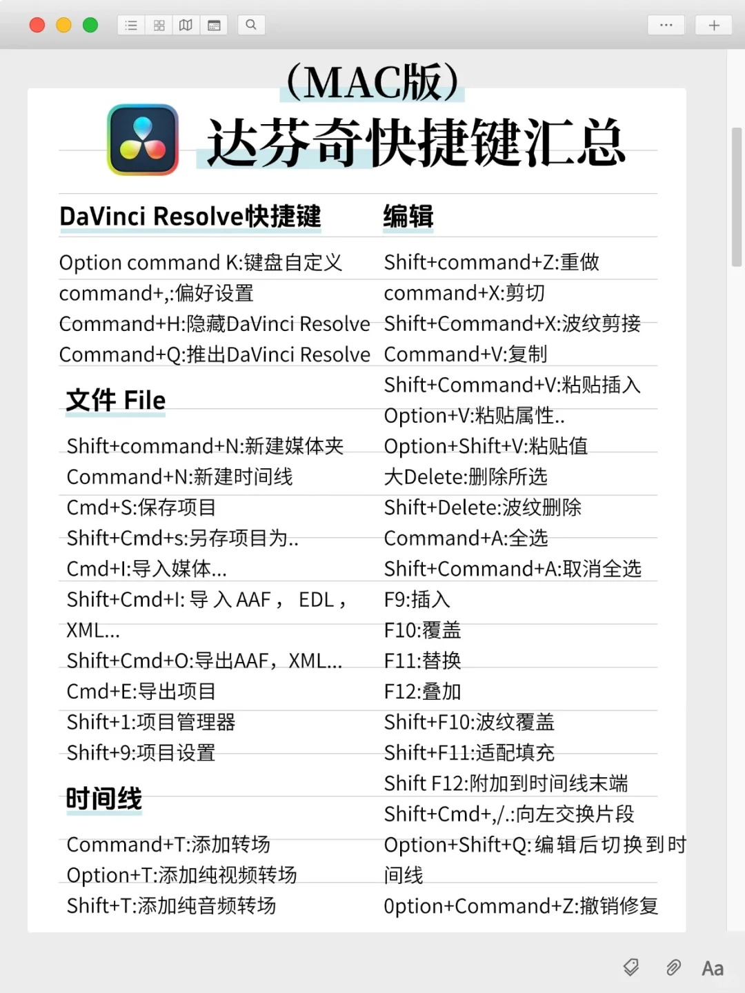 DaVinci Resolve达芬奇快捷键汇总|Win+Mac版