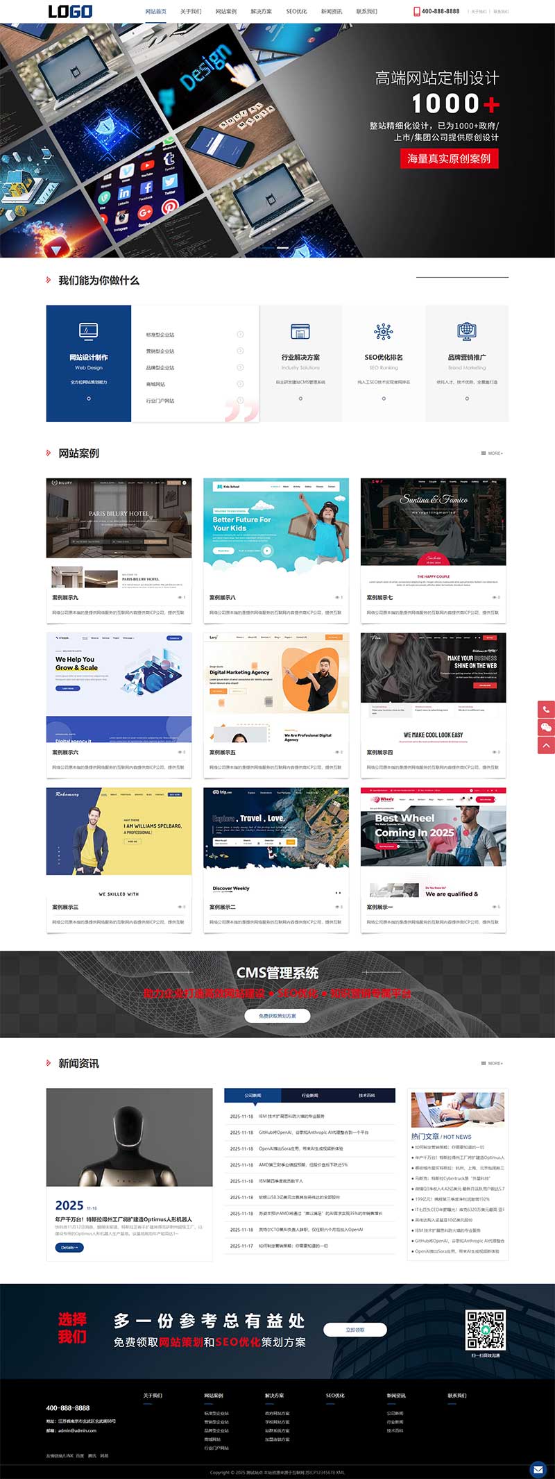 该模板以蓝色和红色色风格为主,页面布局宽屏设计,栏目导航随页面滚动悬浮于顶部,整体大气。主要栏目有首页、作品案例、解决方案、SEO优化、新闻资讯、关于我们和联系我们7个栏目,适合网络建站公司使用。